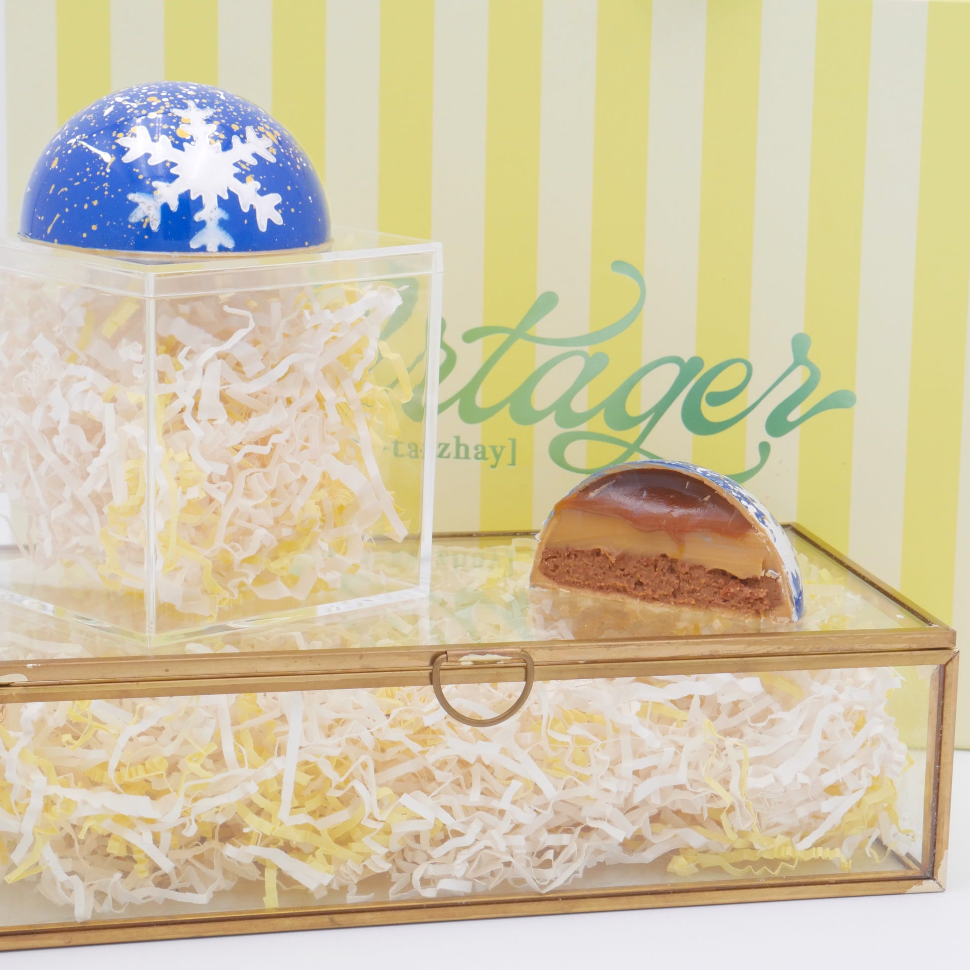 A true Partager signature. Our giant bon bon layers salted caramel, luminous gold ganache, and a buttery cookie crunch beneath a smooth Callebaut Gold shell. Decadent, golden, and irresistibly generous.